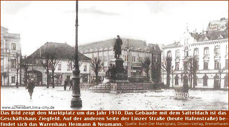 Und im Jahr 1849 verkaufte J. C. Tecklenborg sein Grundstück am Markt 12 an den aus Emden stammenden Kaufmann Wilhelm Andreas Ziegfeld. Dort, wo heute an der Ecke Bürgermeister-Smidt-Straße zur Linzer Straße ein großes Wohn- und Geschäftshaus (ehemalige Geschäftsräume Firma Warrings) steht, befand sich bis zum 18. September 1944 das Haus Am Markt 12. Es war ein älteres mehrstöckiges Haus, das in der ersten Hälfte des 19. Jahrhunderts im schlichten klassizistischen Stil errichtet wurde.